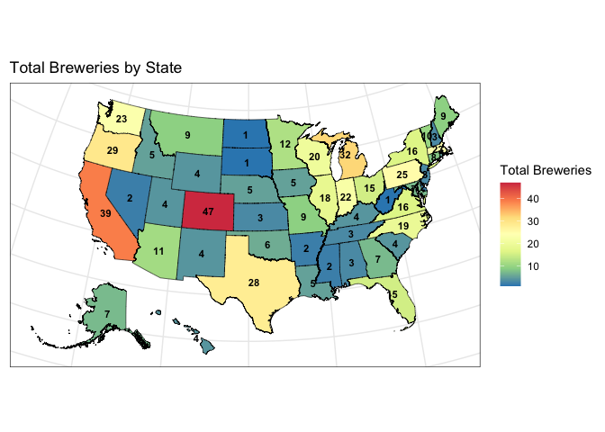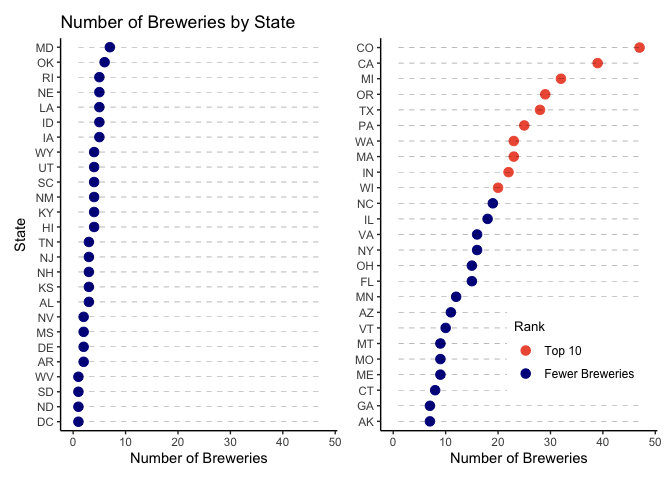 Question 1: Here we present how many breweries are in each state with two plots. One is a dot plot that ranks states in order from fewest to the most breweries. The second is a map of the U.S. with the number of breweries labeled on each state to make it easier to see regions with more breweries.