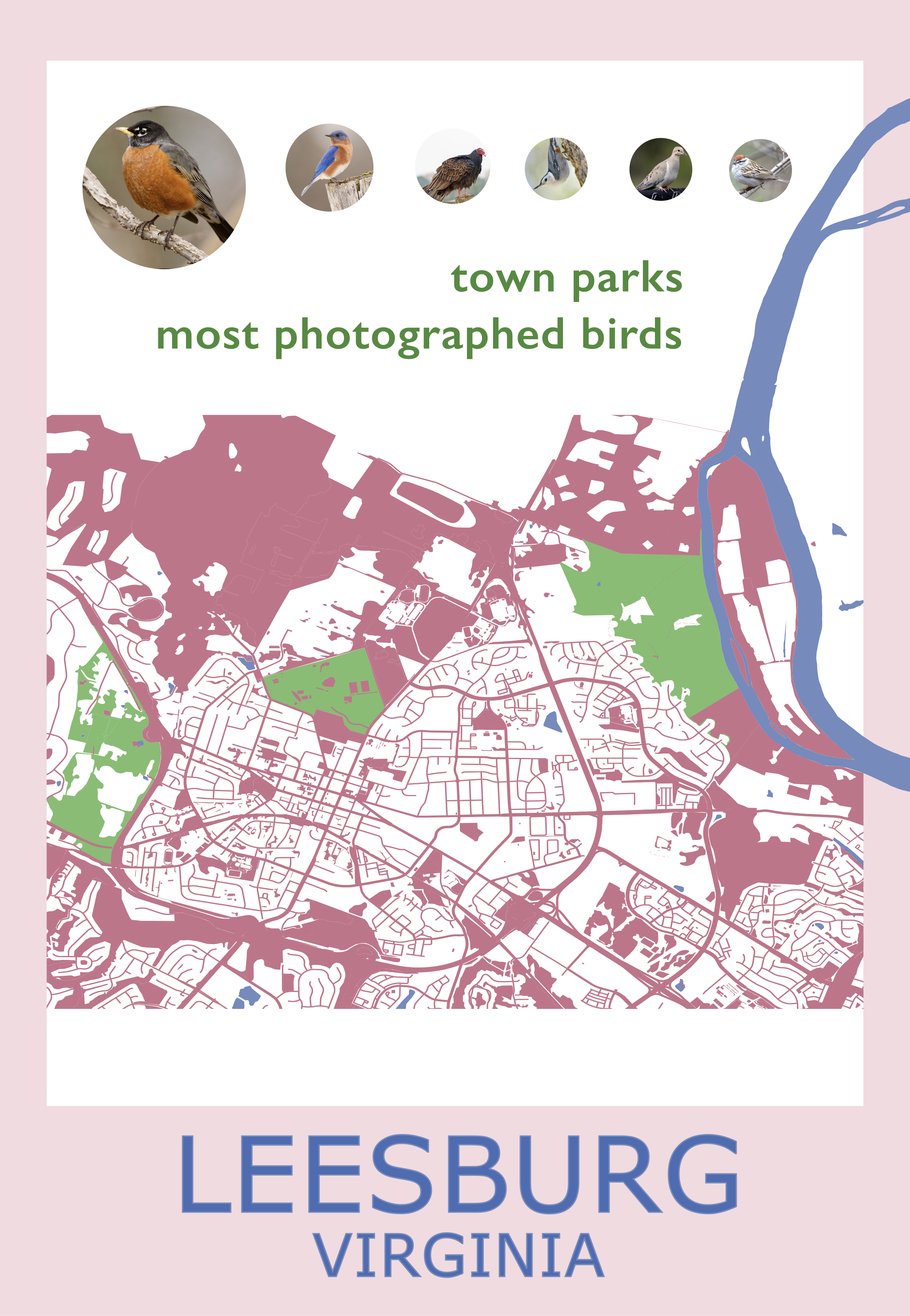 A visualization of the relative frequency of commonly photographed birds uploaded on iNaturalist in parks in the town of Leesburg, VA. This project explores design principles such as hierarchy, balance, space, and color, while considering the key components of datasets: structures, attributes, and dimensionality. Created with Inkscape. Map source: OpenStreetMap. Photo credits from iNaturalist: American Robin – Dimitris Salas, Eastern Bluebird – Michael Gallo, Turkey Vulture – Seig, White-breasted Nuthatch – SW, Mourning Dove – Donna Pomeroy, Chipping Sparrow - SW.