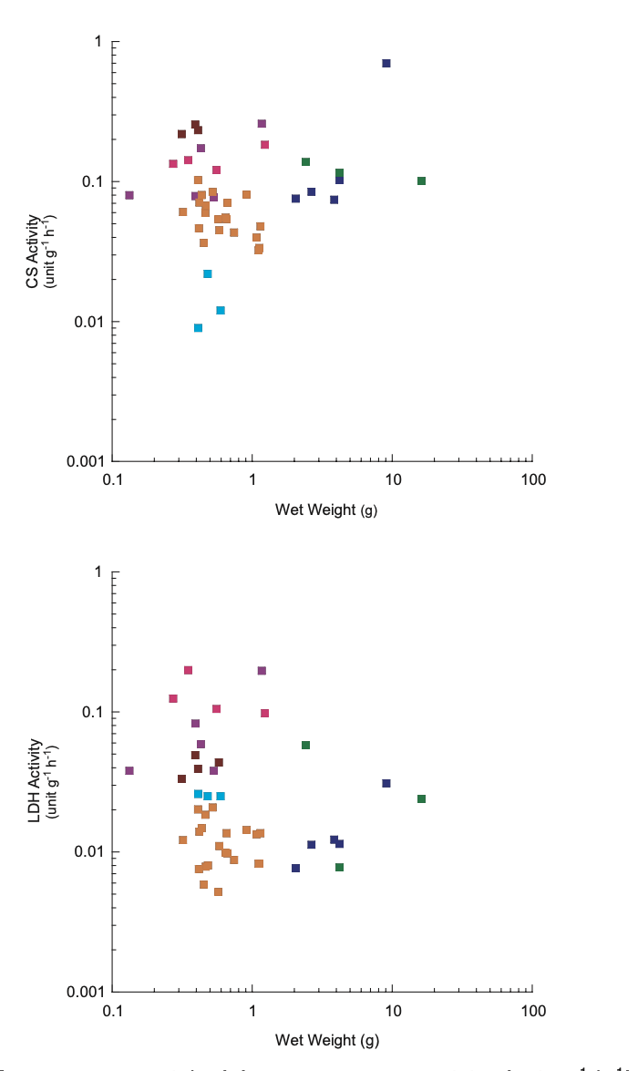 No association was found between mass and either CS or LDH activity. Individual species are depicted by color. Beroe cucumis (dark blue), Beroe forskalii (green), Charistephane fugiens (cyan), Hormiphora californensis (pink), Lampea pancerina (purple), Nephalotena sp. (brown), Pleurobrachia bachei (orange).