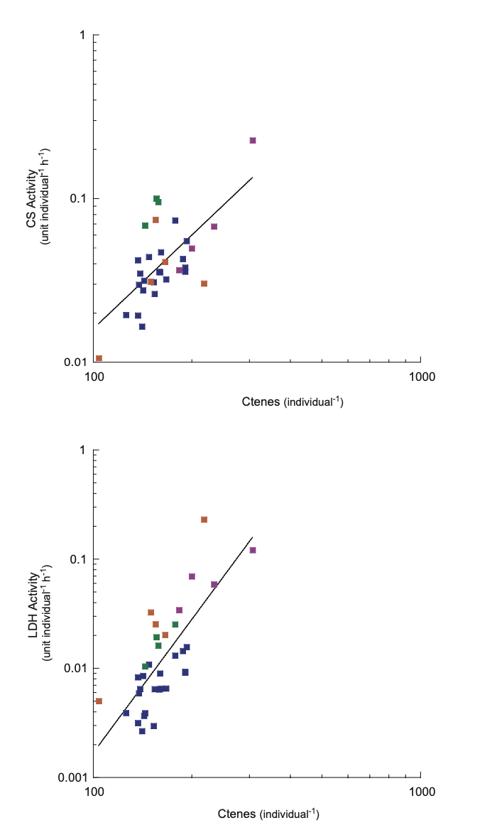 CS activity was greater than LDH activity in all species. Charistephane fugiens was the only species with detectable levels of ODH. This illustrates the aerobic nature of ctenophores. No relationship among all species was found between body size (g wet weight) and mass-specific enzyme activity (Fig. 4). However, mass-specific CS activity increased as a function of body size in P. bachei. Both CS and LDH activity increased in nearly all cydippid ctenophores sampled as a function of number of ctenes (Fig. 5).