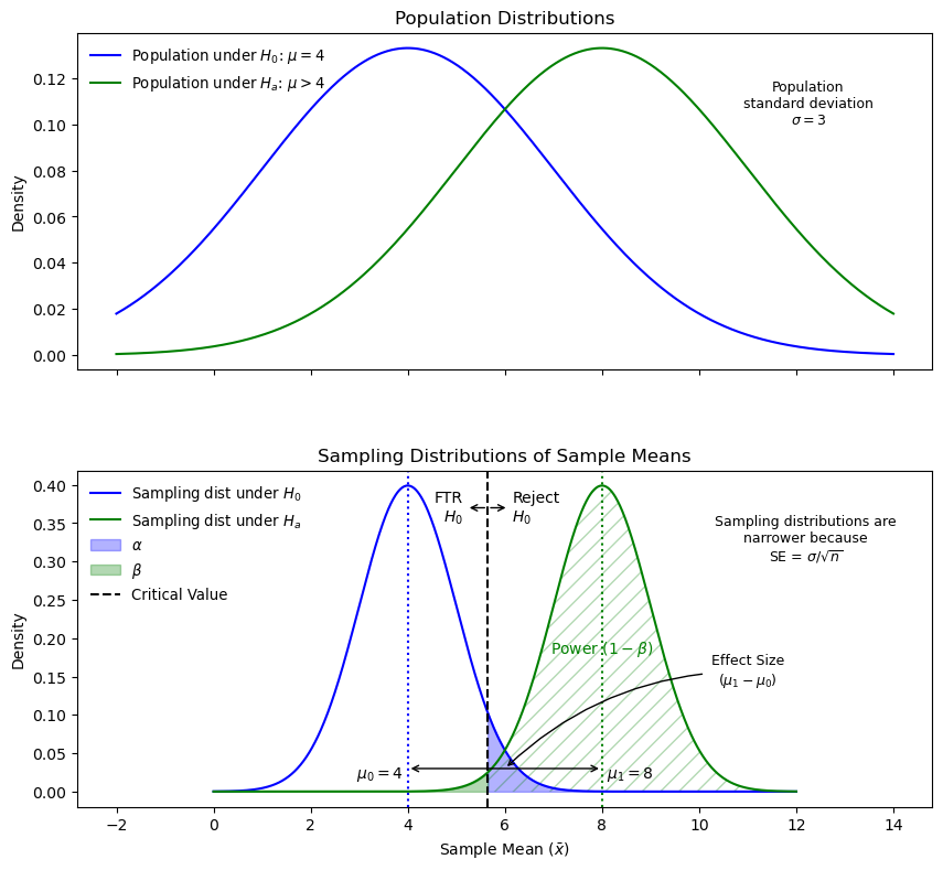 Sampling Distributions, Power, and Effect Size. This diagram illustrates the relationship between effect size, critical values, power, and Type I and Type II errors. Narrower distributions from larger sample sizes improve the ability to detect true differences.
