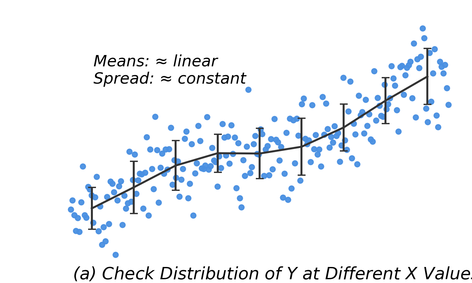 - For every value of \(x\), the spread of \(y\) should be the same.