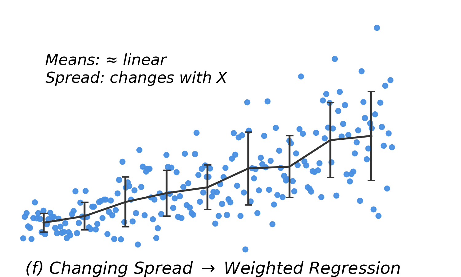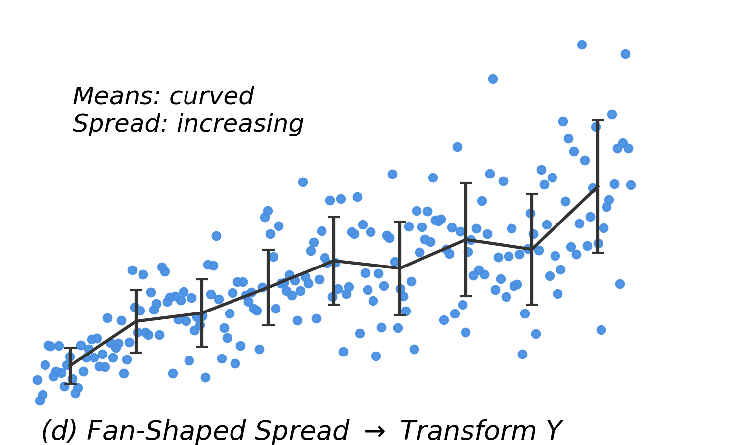 - Use weighted least squares to down-weight observations with larger variance so they don’t influence the regression model as much as observations closer to the line.