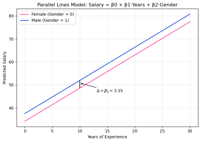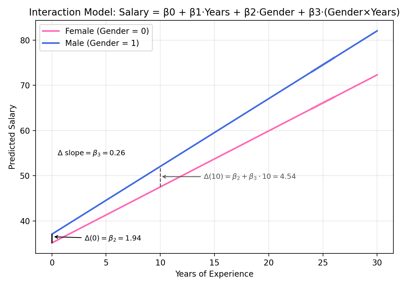 \text{Salary} = \beta_0 + \beta_1 \cdot \text{Years} + \beta_2 \cdot \text{Gender}
