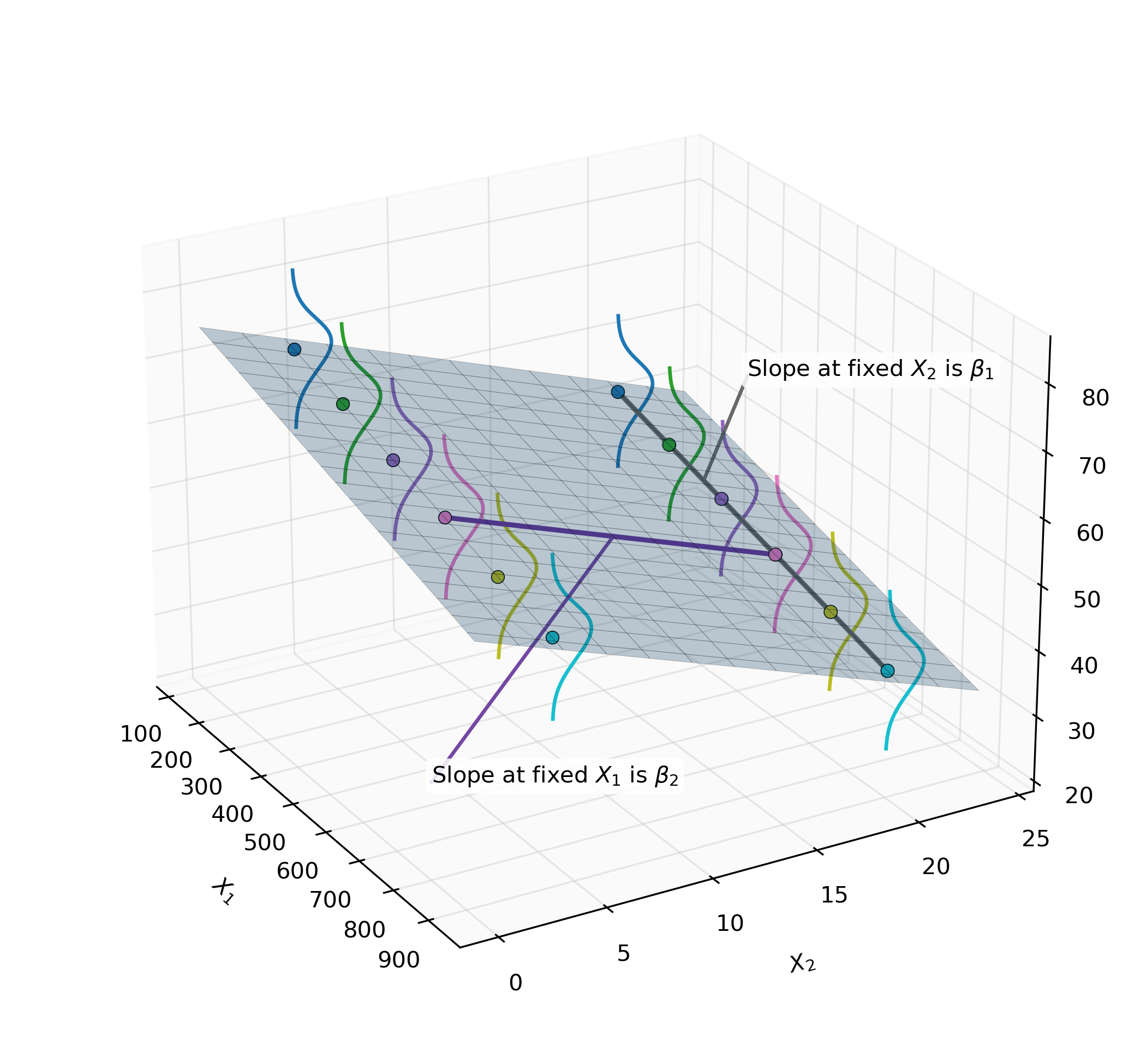 - \(\beta_2\) represents the slope along \(X_2\), holding \(X_1\) constant.