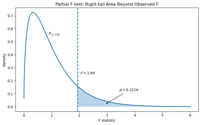 - Critical value (\(\alpha = 0.05\)): \(F_{0.05, 3, 778} = 2.62\)