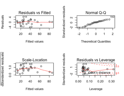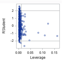 A point with a high Cook’s D has both a high residual value and high leverage, meaning it is an influential point in determining the regression equation. A high residual value results when the observed value is far from the predicted value (the value on the regression line when calculated without that point, or the mean of the distribution of \(y\) for that value of \(x\)). A high leverage value results when the \(x\) value of the point is far from the mean of the \(x\) values. The point on the scatterplot with a high Cook’s D is the point in the lower right box (with a leverage of ~0.02, and a studentized residual of ~-2.75).