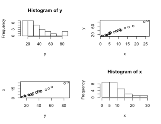 I would disagree that SLR is not appropriate. The assumption of normality is not for the distribution of \(x\) or the distribution of \(y\) overall, but for the distribution of \(y\) at each value of \(x\). The scatterplots of \(x\) vs \(y\) and \(y\) vs \(x\) indicate a strong linear trend. The residual plots also support the appropriateness of SLR. The residuals look normally distributed in the QQ plot. The residual scatterplot is randomly scattered around zero with no evidence against equal standard deviation. The standardized residual plot is randomly scattered and within normal values, showing no evidence of high residual points. The Cook’s D plot has a few higher leverage points but no points with high Cooks D to indicate influential outliers.